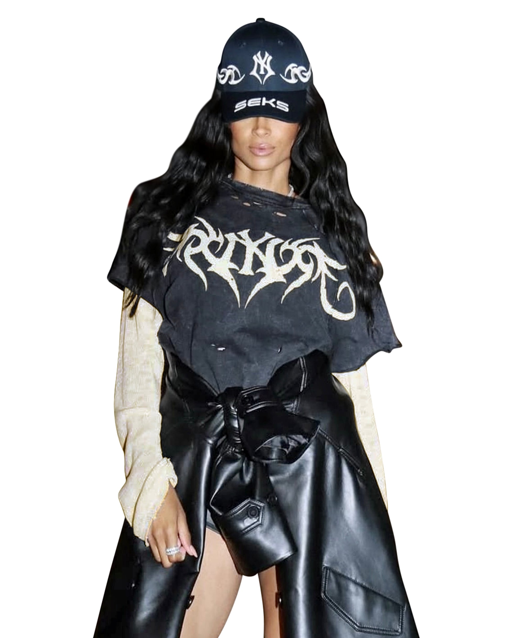 Embroidered, washed, printed, and distressed shirt with long knit sleeves that will fray with experience. Oversized fit, genderless.